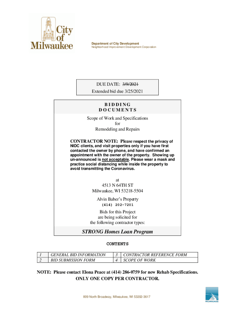 Department of City Development Neighborhood Improvement Development Corporation DATE: 3×9/2021 Extended bid due 3×25/2021 BIDDING DOCUMENTS Scope of Work and Specifications for Remodeling and Repairs