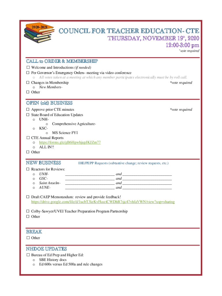 20202021COUNCIL FOR TEACHER EDUCATION CTE THURSDAY, NOVEMBER 19th, 2020 12:003:00 pm *vote requiredCALL to ORDER & MEMBERSHIP Welcome and Introductions (if needed) Per Governors Emergency Orders meeting