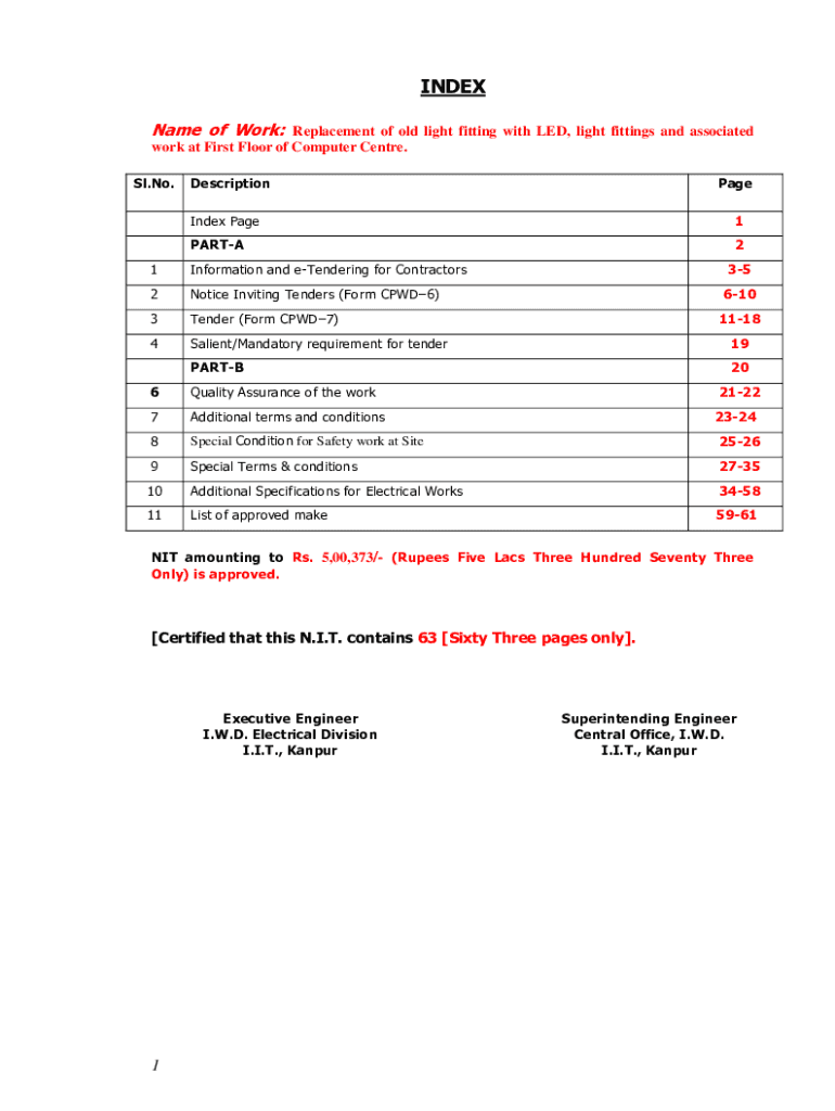 INDEX Name of Work: Replacement of old light fitting with LED, light fittings and associated work at First Floor of Computer Center. SL. No. DescriptionPageIndex Page1PARTA21Information and tendering