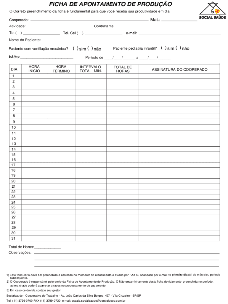 FICA DE APONTAMENTO DE PROD UO O Correct preenchimento the FICA fundamental para Que VOC recent SUA produtividade em diaAtividade: Tel.×Contestant:)Tel. CEL ()email:Nome do Patients: Patients pediatric