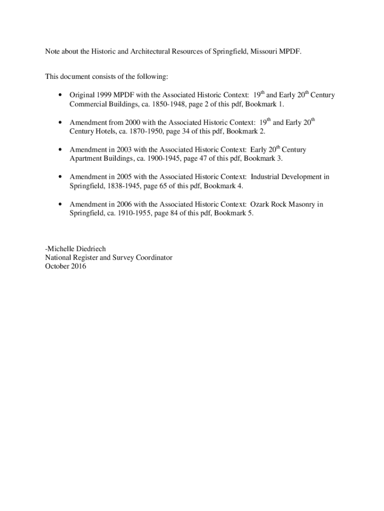 Note about the Historic and Architectural Resources of Springfield, Missouri PDF. This document consists of the following: Original 1999 PDF with the Associated Historic Context: 19th and Early 20th