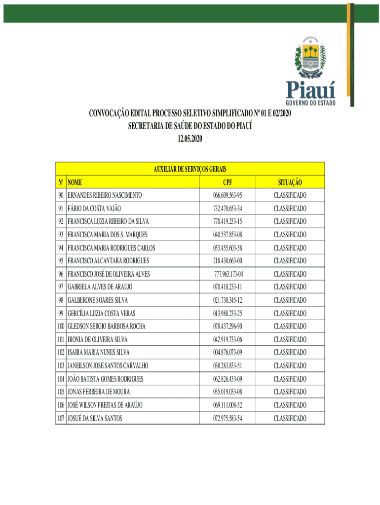 NONVOCAL EDIT AL PROCESS SELECTIVE SIMPLIFIED N 01 E 02/2020 SECRETARIAT DE SADE DO ESTATE DO IAU 12.05.2020 AUXILIARY DE SERVOS GERVAIS NNOMECPFSITUAO90ERNANDES RIBEIRO NASCIMENTO066.609.56395CLASSIFICADO91FBIO