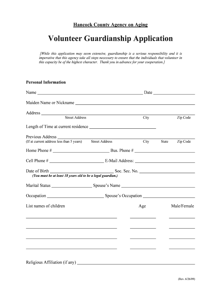 Hancock County Agency on Aging Volunteer Guardianship Application While this application may seem extensive, guardianship is a serious responsibility, and it is imperative that this agency take all