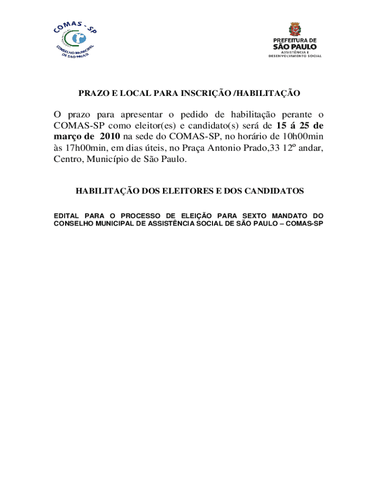 PRADO E LOCAL PARA INSCRIBE /HABILITATE Prado para presenter o period DE habilitates per ante o COMA SSP Como elector×BS) e candidate’s) SER DE 15 25 DE mar ode 2010 Na see do COMA SSP, no horrid