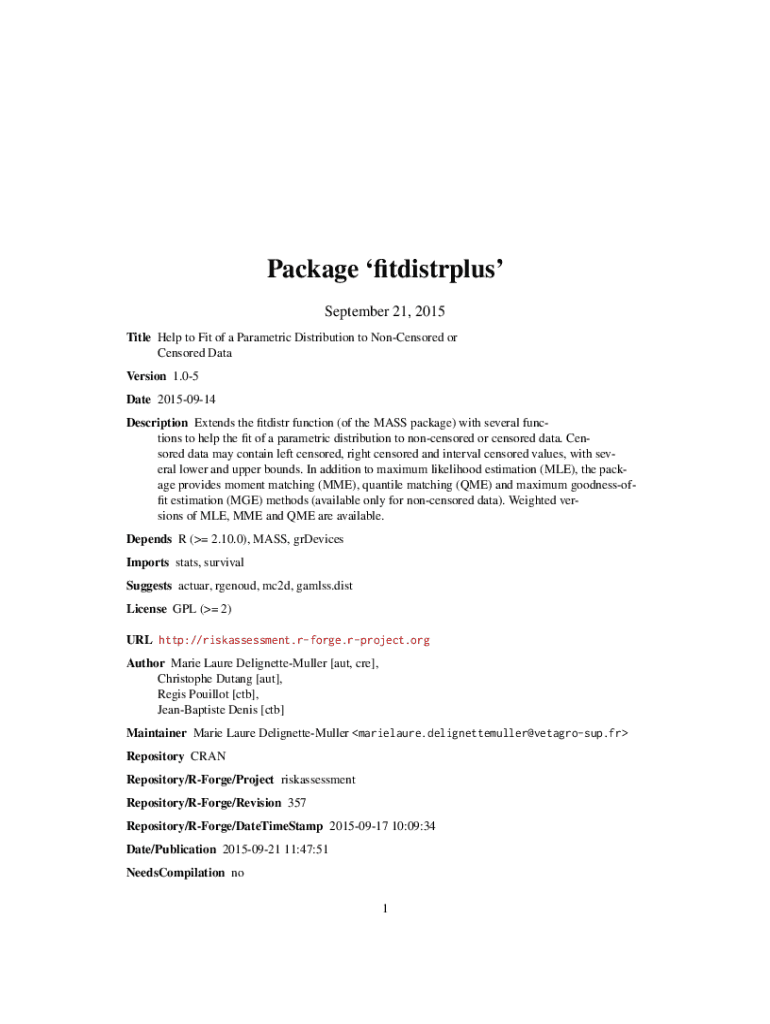 Package fitdistrplus September 21, 2015, Title Help to Fit of a Parametric Distribution to Uncensored or Censored Data Version 1.05 Date 20150914 Description Extends the fittest function (of the MASS