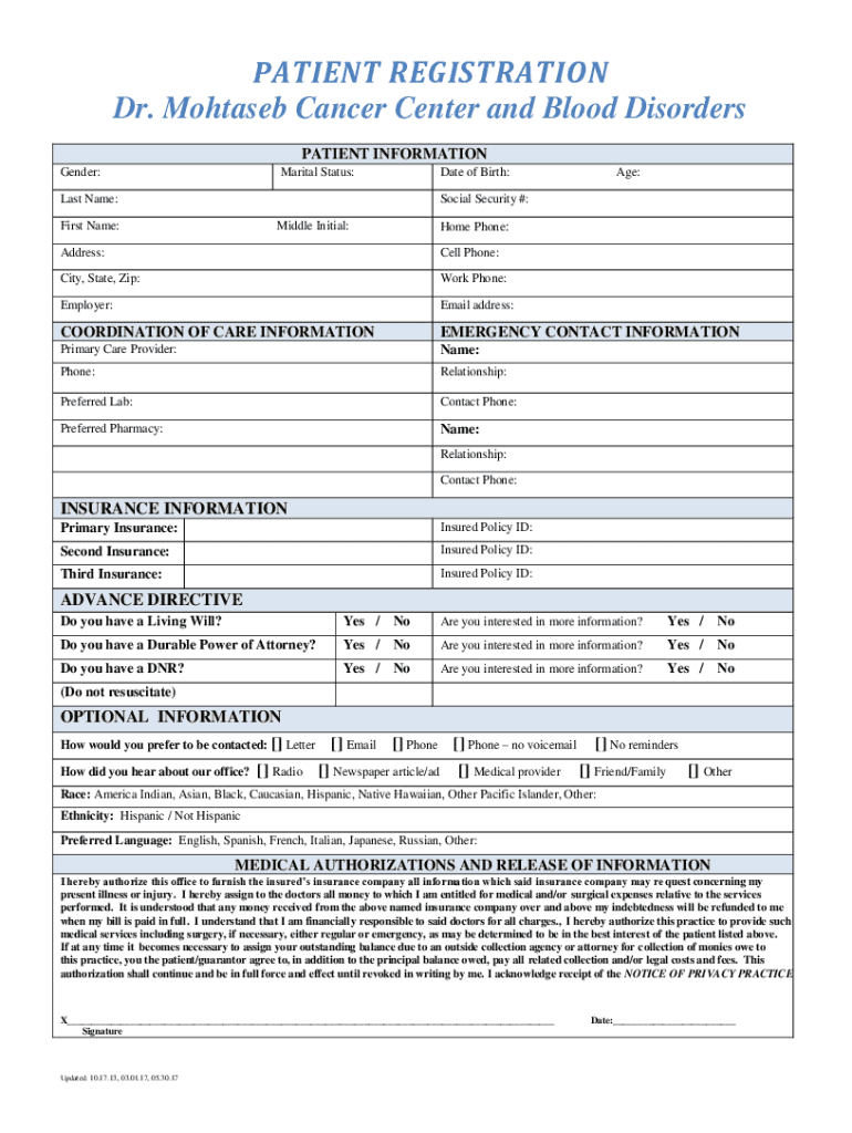PATIENT REGISTRATION Dr. Montage Cancer Center and Blood Disorders PATIENT INFORMATION Gender:Marital Status:Date of Birth:Last Name:Age:Social Security #:First Name:Middle Initial:Home Phone:Address:Cell