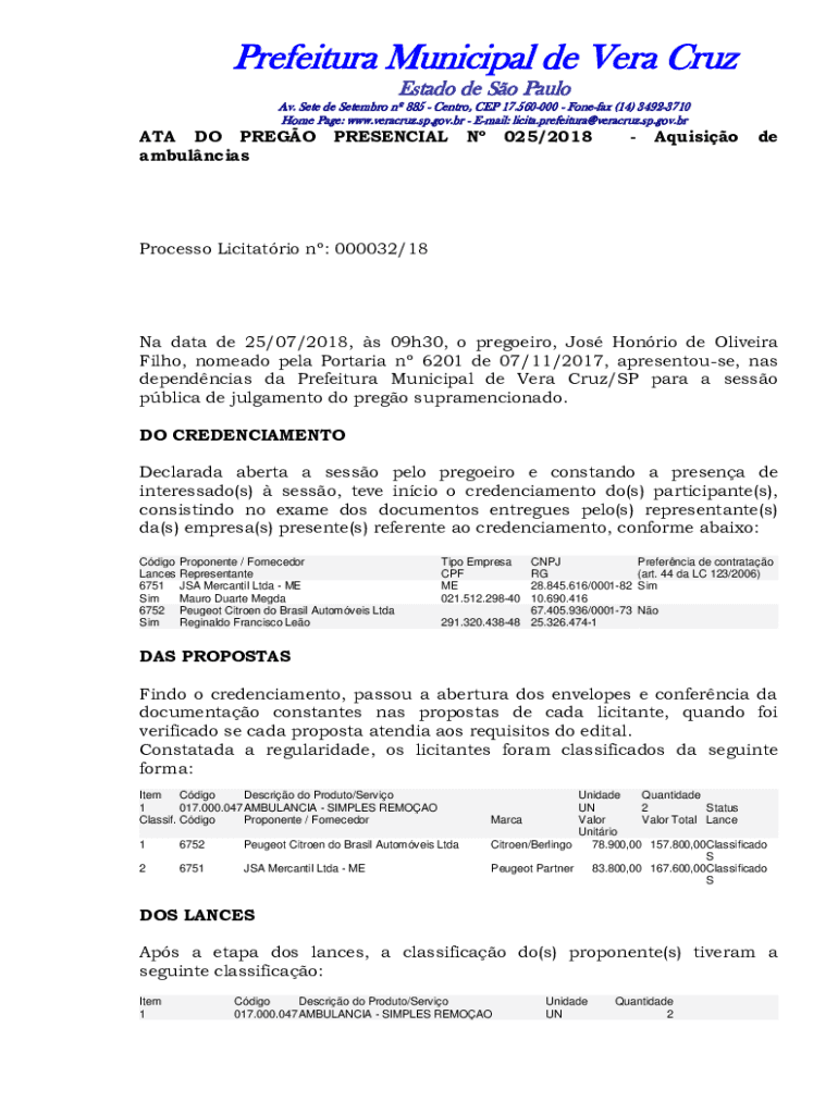 Prefecture Municipal de Vera Cruz Est ado de So Paulo Av. Set de Setembro n 885 CENTR, CEP 17.560000 Funeral (14× 34923710 Home Page: www.veracruz.sp.gov.br Email: licit. Prefecture×Veracruz.SP.gov.brat