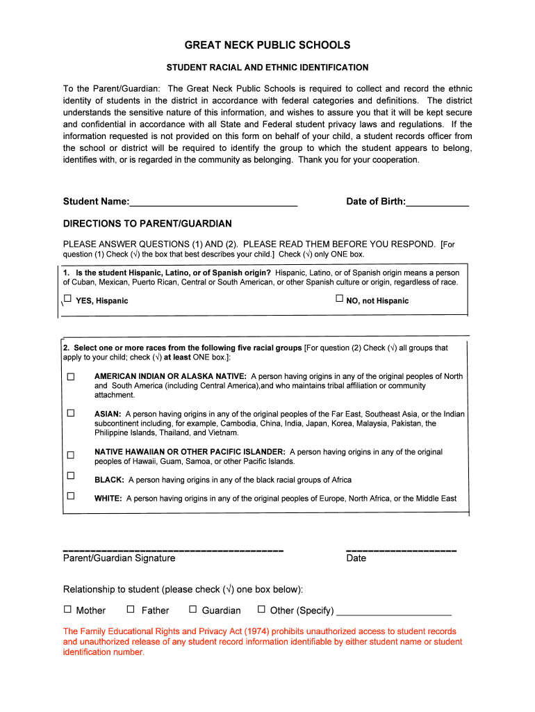 To the Parent/Guardian: The Great Neck Public Schools is required to collect and record the ethnic