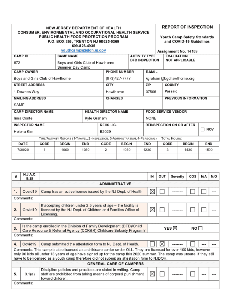 REPORT OF INSPECTION JERSEY DEPARTMENT OF HEALTH CONSUMER, ENVIRONMENTAL AND OCCUPATIONAL HEALTH SERVICE PUBLIC HEALTH FOOD PROTECTION PROGRAM P.O. BOX 369, TRENTON NJ 086250369 6098264935 youth camps×DOH.NJ.gov