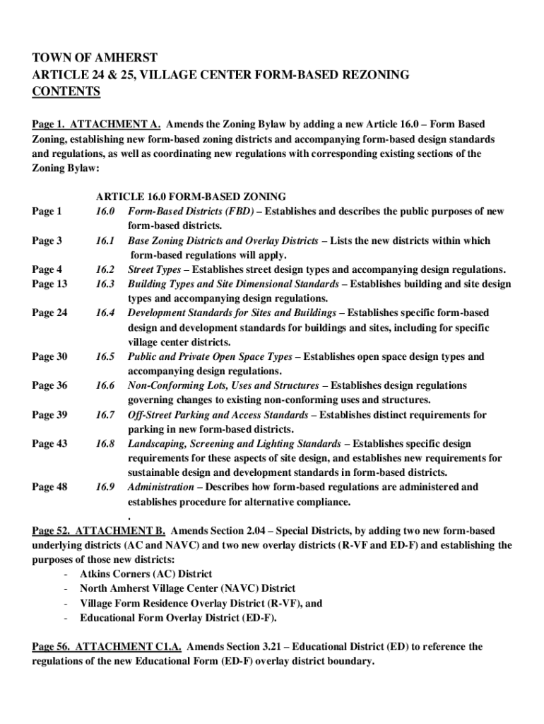 TOWN OF AMHERST ARTICLE 24 & 25, VILLAGE CENTER FORMED REZONING CONTENTS Page 1. ATTACHMENT A. Amends the Zoning Bylaw by adding a new Article 16.0 Form Based Zoning, establishing new form based zoning