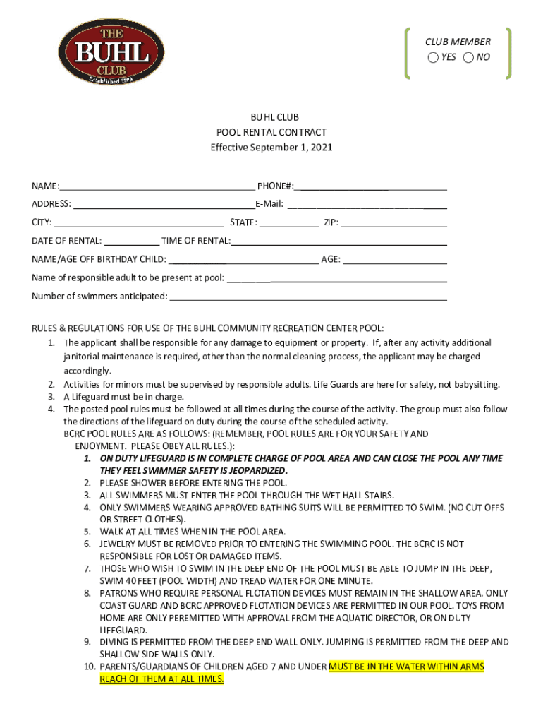 BUHLCLUB POOLRENTALCONTRACT EffectiveSeptember1,2021CLUBMEMBER YES NO NAME: PHONE#:___ADDRESS:Email: ___CITY: STATE:ZIP: ___TIMEOFRENTAL:___DATEOFRENTAL:NAME×AGEOFFBIRTHDAYCHILD:___ AGE: