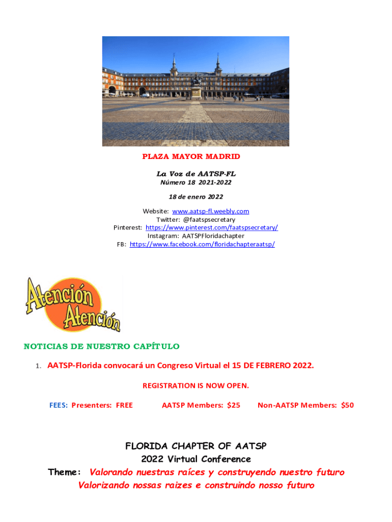 PLAZA MAYOR MADRID La VOZ de AATSPFL Nero 18 20212022 18 de Nero 2022 Website: www.aatspfl.weebly.com Twitter: @faatspsecretary Pinterest: HTTPS://www.pinterest.com×faatspsecretary/ Instagram: AATSPFloridachapter