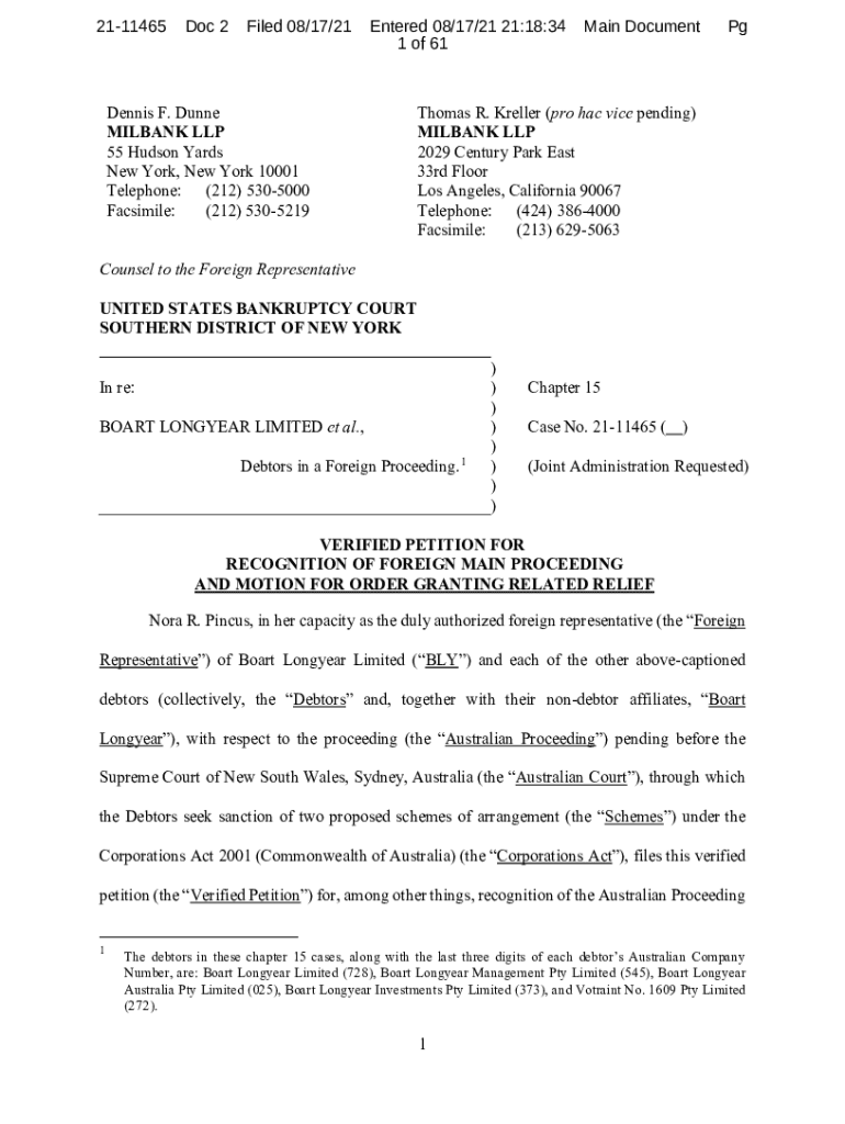 2111465Doc 2Filed 08×17/21Entered 08×17/21 21:18:34 1 of 61Dennis F. Dunne MILAN LLP 55 Hudson Yards New York, New York 10001 Telephone: (212× 5305000 Facsimile: (212) 5305219Main DocumentPgThomas