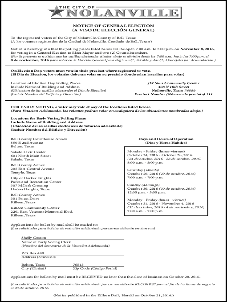 NOTICE OF GENERAL ELECTION (A VISA DE ELECTION GENERAL) To the registered voters of the City of Loganville, County of Bell, Texas: (A Los rotates registrants DE la Ciudad de Nolanville, Condado de