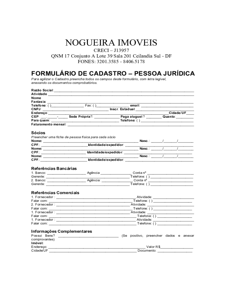 Nogueiraimoveisdf.combranexoscadastro-pessoacadastro pessoa jurídica is needed by individuals or companies who are interested in availing the services or benefits provided by Nogueira Imóveis DF. This form is specifically for legal entities or businesses looking to establish a professional relationship with Nogueira Imóveis DF, such as property buying, selling, renting, or other real estate related transactions.