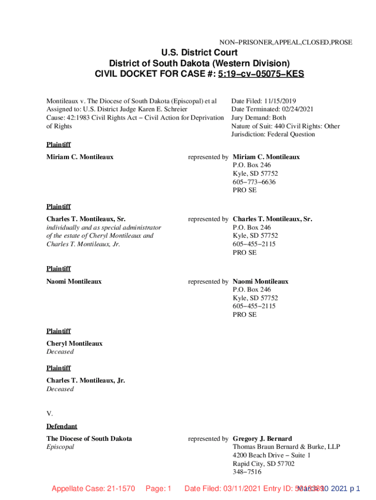 PRISONER, APPEAL, CLOSED, PROSE. S. District Court District of South Dakota (Western Division) CIVIL DOCKET FOR CASE #: 5:19cv05075KES Montileaux v. The Diocese of South Dakota (Episcopal) et al.