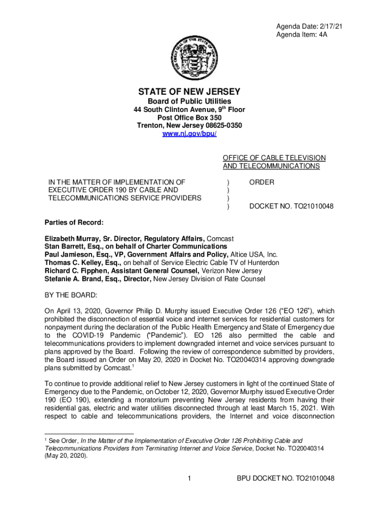 Agenda Date: 2×17/21 Agenda Item: 4ASTATE OF NEW JERSEY Board of Public Utilities 44 South Clinton Avenue, 9th Floor Post Office Box 350 Trenton, New Jersey 086250350 www.nj.gov×BPU×OFFICE OF CABLE