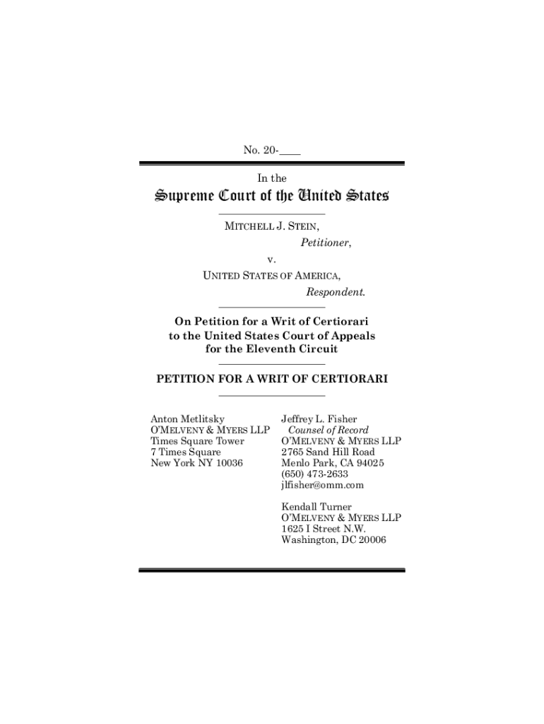 No. 20___ In supreme Court of the United States ___ MITCHELL J. STEIN, Petitioner, v. UNITED STATES OF AMERICA, Respondent. ___ On Petition for a Writ of Certiorari to the United States Court of Appeals