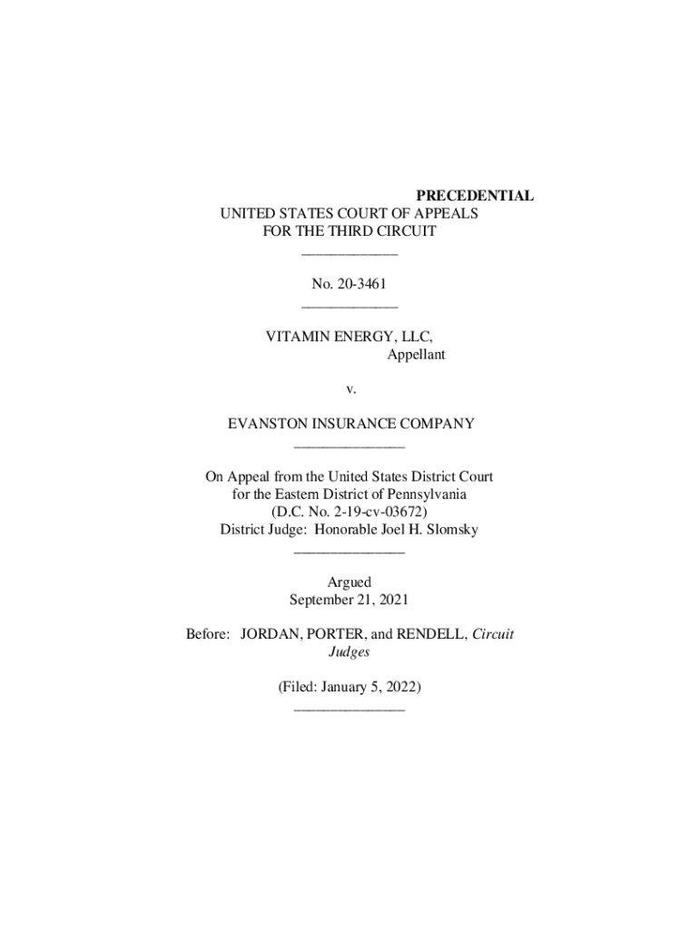 PRESIDENTIAL UNITED STATES COURT OF APPEALS FOR THE THIRD CIRCUIT ___ No. 203461 ___ VITAMIN ENERGY, LLC, Appellant v. EVANSTON INSURANCE COMPANY ___ On Appeal from the United States District Court