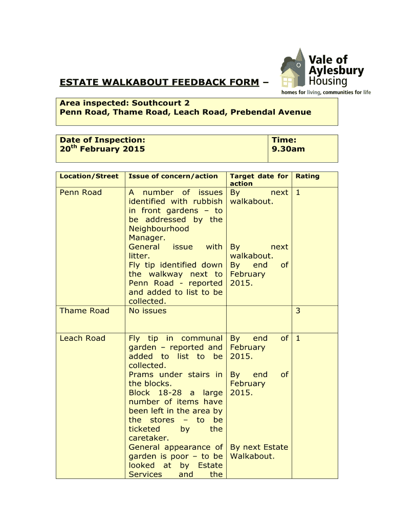 ESTATE WALKABOUT FEEDBACK FORM Area inspected: South court 2 Penn Road, Theme Road, Leach Road, Prerenal Avenue Date of Inspection: 20th February 2015 Time: 9.30am Location/Street Issue of concern/action