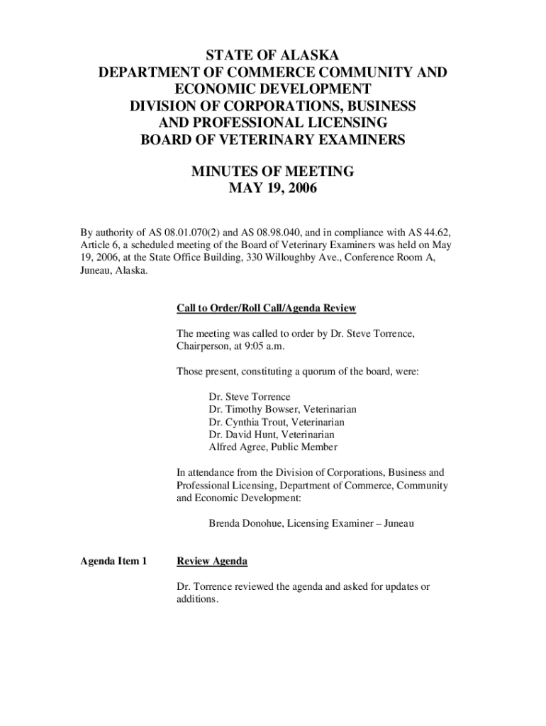 STATE OF ALASKA DEPARTMENT OF COMMERCE COMMUNITY AND ECONOMIC DEVELOPMENT DIVISION OF CORPORATIONS, BUSINESS AND PROFESSIONAL LICENSING BOARD OF VETERINARY EXAMINERS MINUTES OF MEETING MAY 19, 2006,