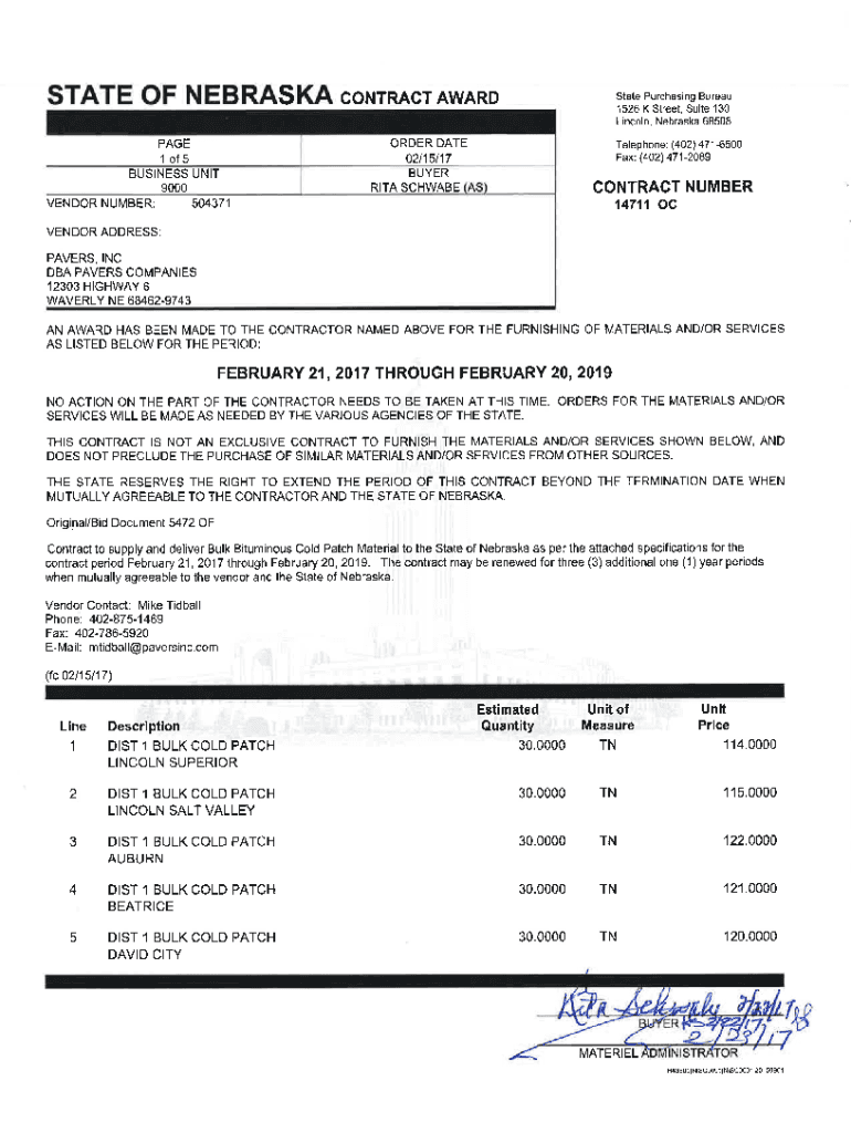 Byron L. Diamond Director Acting Director Pete Ricketts, GovernorADDENDUM ONE QUESTIONS and ANSWERS Date:November 23, 2016To:All BiddersFrom:Rita Schwa be, Buyer AS Material State Purchasing Bureau