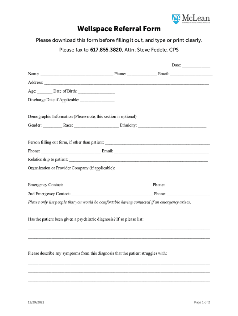Well space Referral Form Please download this form before filling it out, and type or print clearly. Please fax to 617.855.3820, Attn: Steve Female, CPS Date: ___ Name: ___ Phone: ___ Email:___ Address: