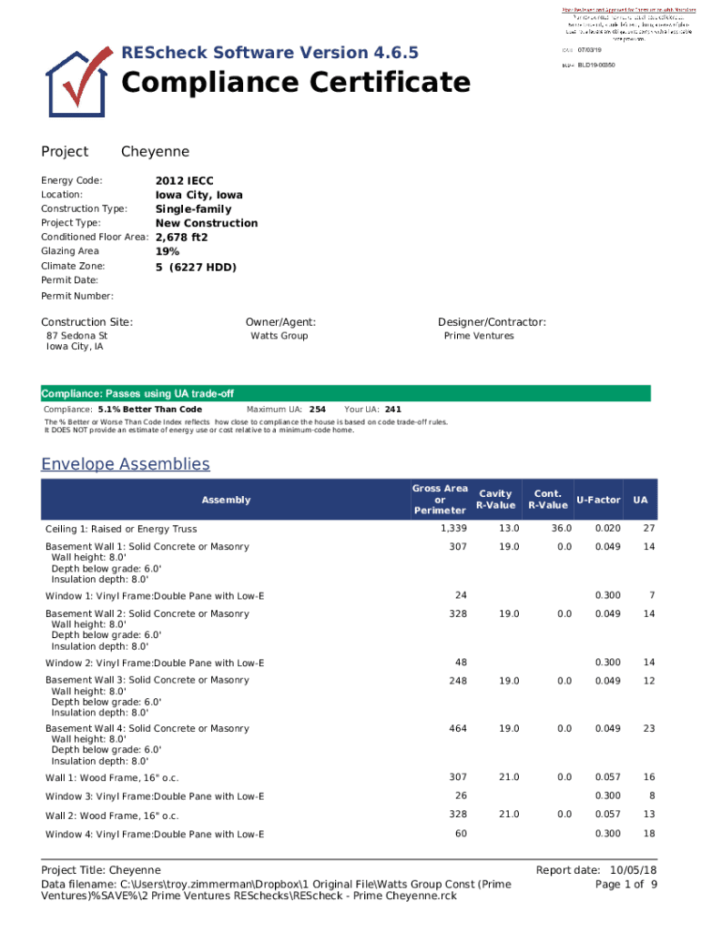 Recheck Software Version 4.6.507×03/19BLD1900350Compliance Certificate ProjectCheyenne2012 IEC Iowa City, Iowa Construction Type: Single family Project Type: New Construction Conditioned Floor Area: