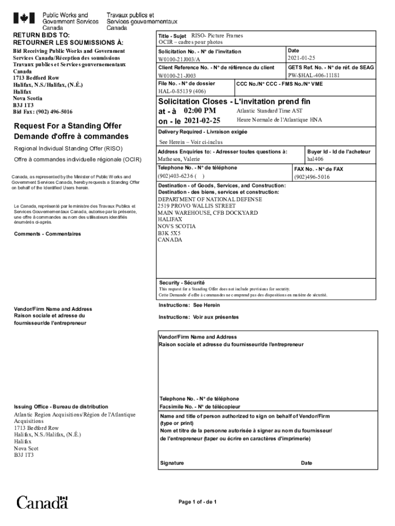 11RETURN BIDS TO: RETURNER LES COMMISSIONS :Title Suet RISE Picture Frames Receiving Public Works and Government Services Canada×Reception DES sou missions Travail public set Services gouvernementaux