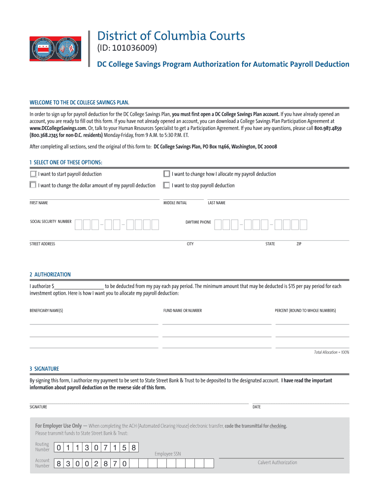Employees in the District of Columbia who wish to set up automatic payroll deductions for contributions to the DC College Savings Plan are eligible to use this form.