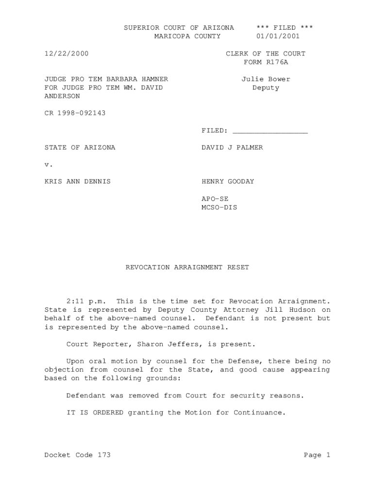 SUPERIOR COURT OF ARIZONA MARICOPA COUNTY 12×22/2000*** FILED *** 01×01/2001CLERK OF THE COURT FORM R176AJUDGE PRO TEM BARBARA HAMMER FOR JUDGE PRO TEM WM. DAVID Andersonville Bower Deputy CR 1998092143