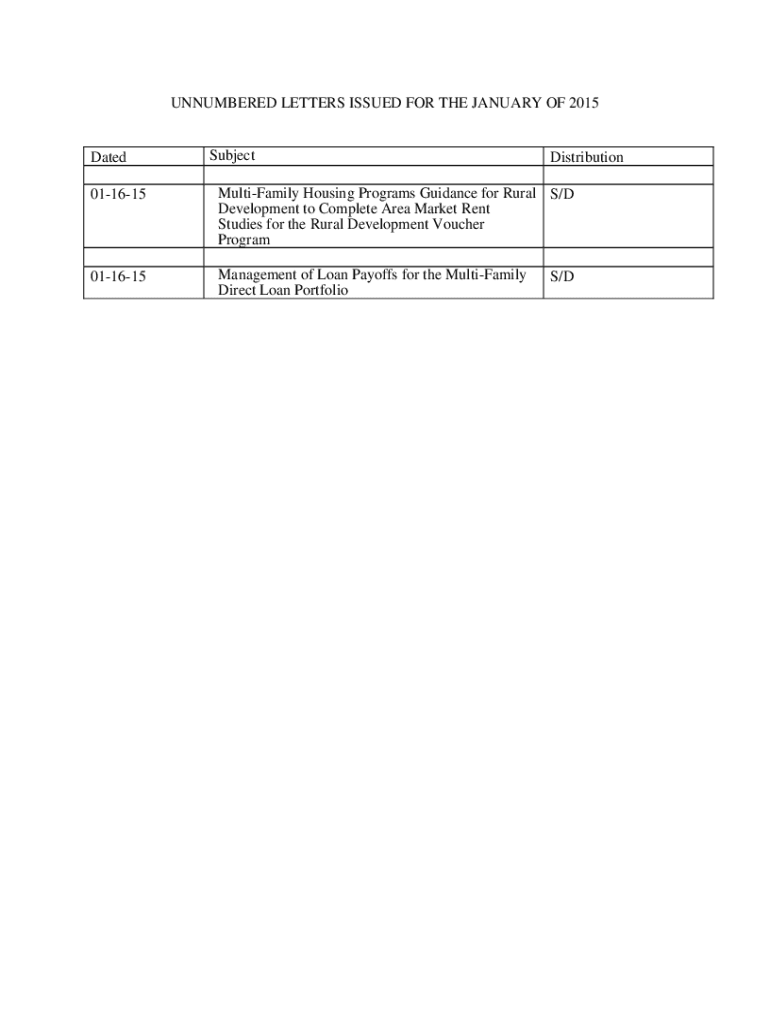 UNNUMBERED LETTERS ISSUED FOR THE JANUARY OF 2015DatedSubjectDistribution011615MultiFamily Housing Programs Guidance for Rural S’D Development to Complete Area Market Rent Studies for the Rural