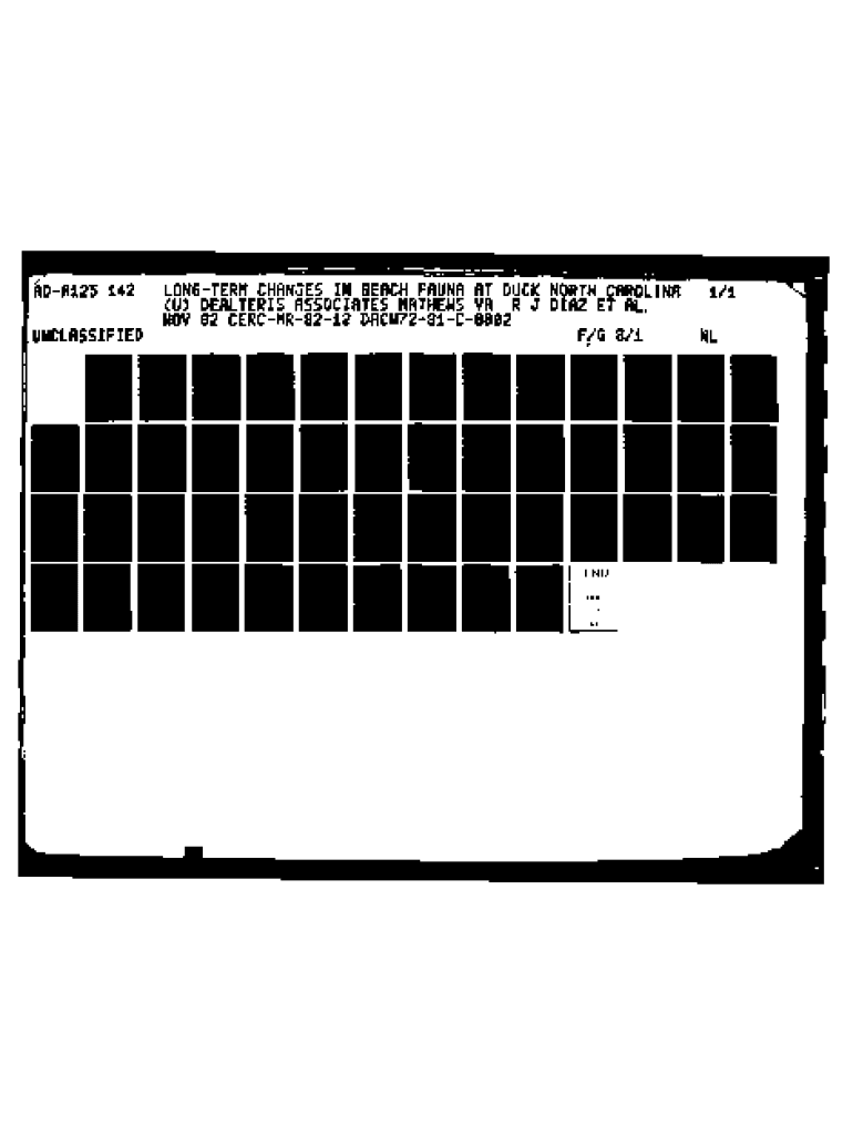 AR125 142UNCLASSIFIEDLONGTERM CHANGES IN BEACH FAUNA DUCK NORTH CAROLINA (U) DEALERS ASSOCIATES Mathews VR R J DIAZ ET AL. NOV 82 CERCMR82i2 DRC72iC88e2 F×G 8×1imhhhhhhENiI×iN5. 4z.×... I1.25i