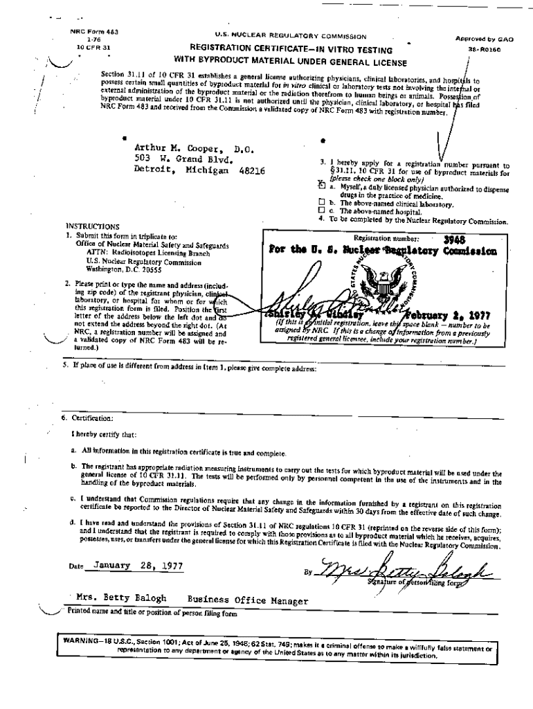 NRC Form 483 176 10 CFR 31U. S. NUCLEAR REGULATORY COMMISSIONApproved by REGISTRATION CERTIFICATE IN VITO TESTING WITH BYPRODUCT MATERIAL UNDER GENERAL LICENSE38R0160Section 31.11 of 10 CFR 31 establishes