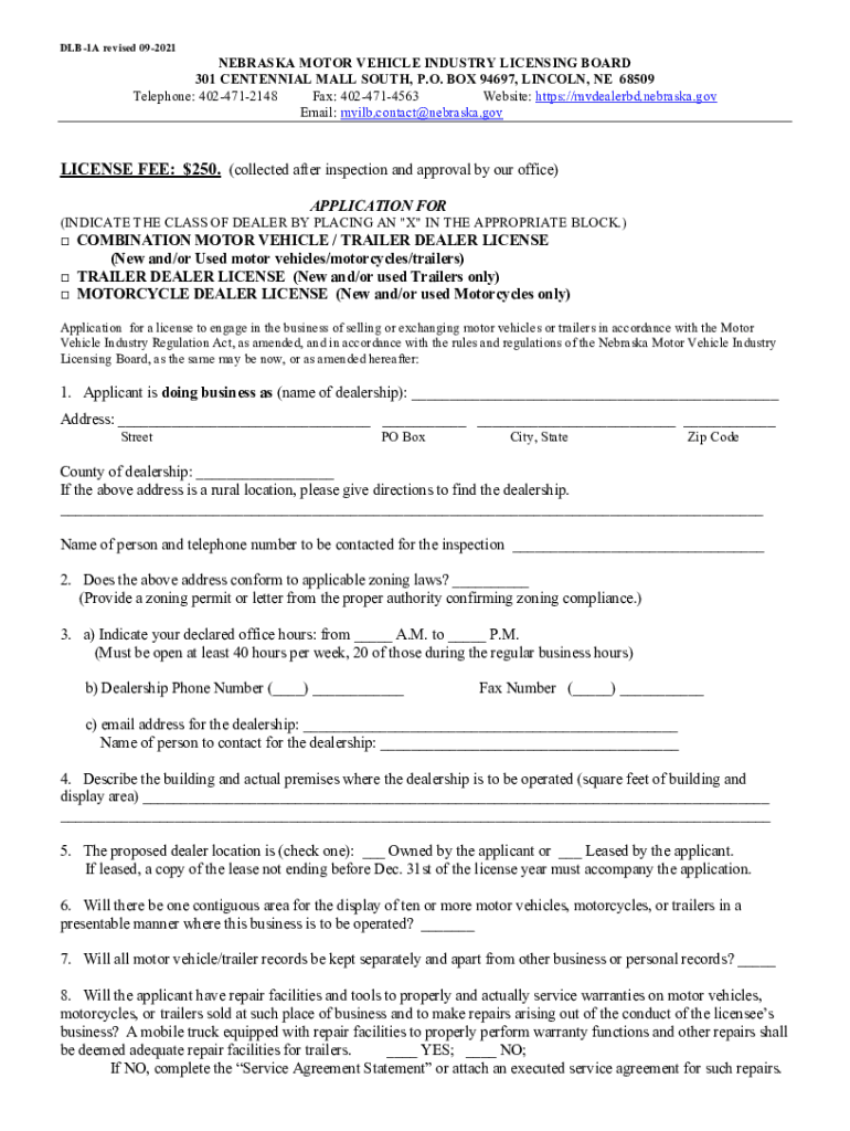DLB1A revised 092021NEBRASKA MOTOR VEHICLE INDUSTRY LICENSING BOARD 301 CENTENNIAL MALL SOUTH, P.O. BOX 94697, LINCOLN, NE 68509 Telephone: 4024712148 Fax: 4024714563 Website: HTTPS://mvdealerbd.Nebraska.gov