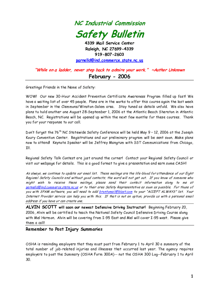 Get the free N.C. Industrial Commission Safety Bulletin, July 2008 Issue