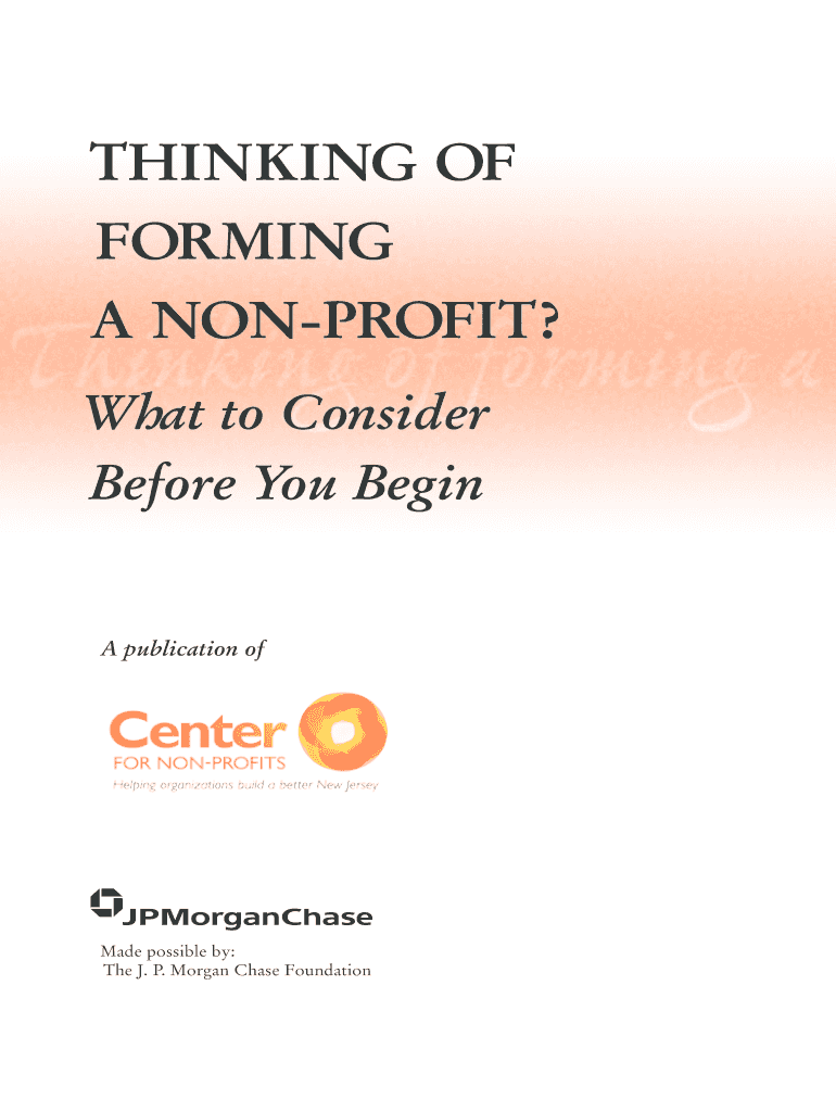THINKING OF FORMING A NON-PROFIT? What to Consider Before You Begin A publication of Made possible by: The J. P. Morgan Chase Foundation TABLE OF CONTENTS 1 So, You're Thinking About Starting a Nonpro?t