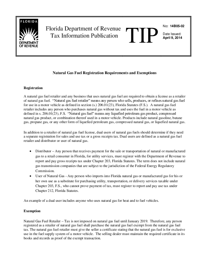Florida Department of Revenue Tax Information PublicationTIPNo: 14B0502 Date Issued: April 9, 2014Natural Gas Fuel Registration Requirements and ExemptionsRegistration A natural gas fuel retailer