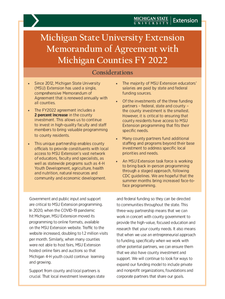 Michigan State University Extension Memorandum of Agreement with Michigan Counties FY 2022 Considerations Since 2012, Michigan State University×MSU) Extension has used a single, comprehensive Memorandum