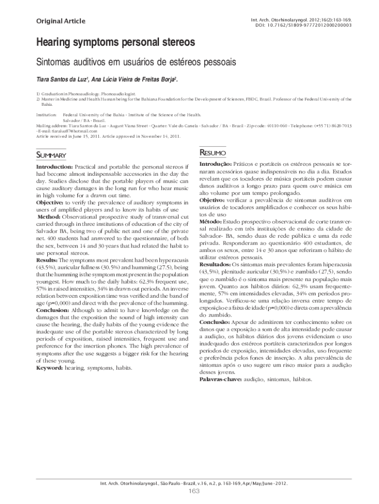 Int. Arch. Otorhinolaryngol. 2012;16×2):163169. DOI: 10.7162×S180997772012000200003Original ArticleHearing symptoms personal stereos Stomas audition em usurious de-stress pressies Tiara Santos the
