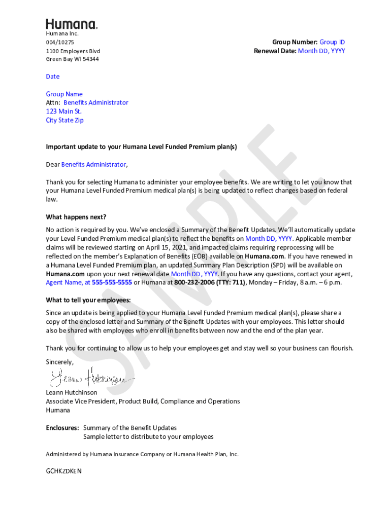 Human Inc. 004×10275 1100 Employers Blvd Green Bay WI 54344Group Number: Group ID Renewal Date: Month DD, YYYYDate Group Name Attn: Benefits Administrator 123 Main St. City State Zip Important update
