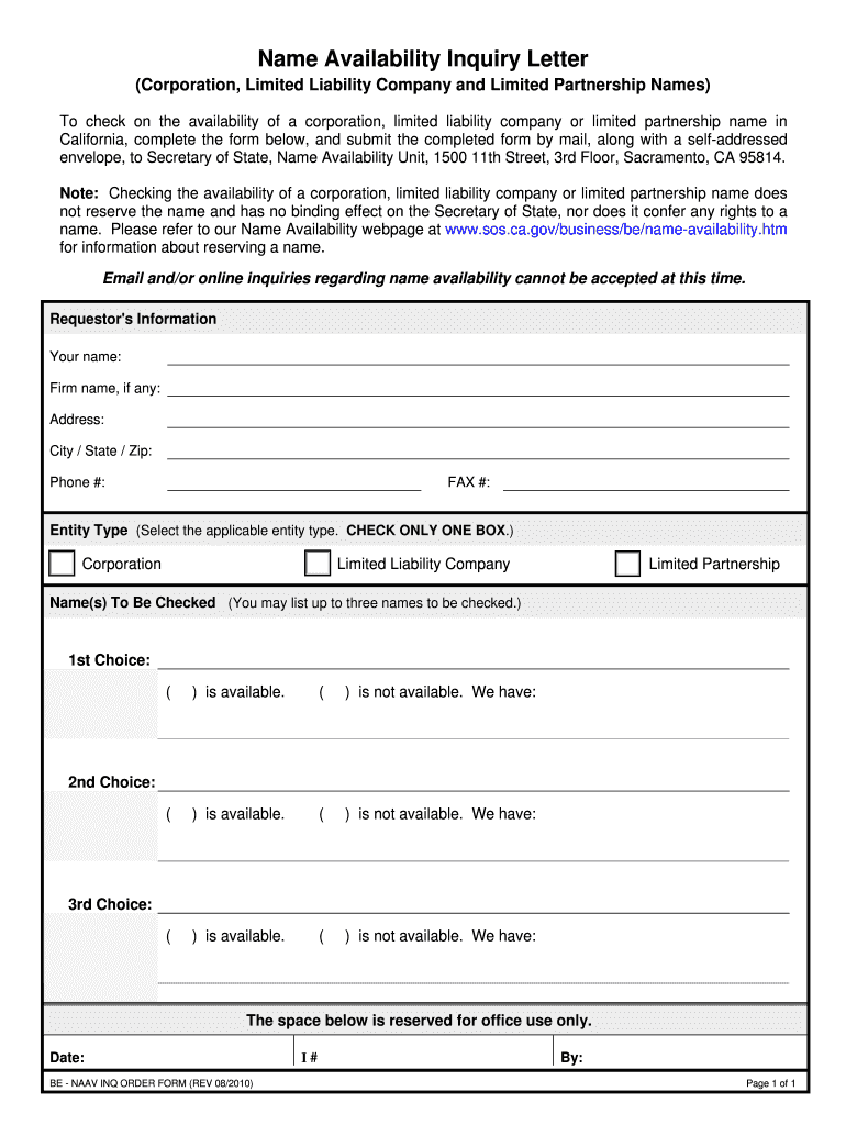 Get the free California Name Availability Inquiry Letter