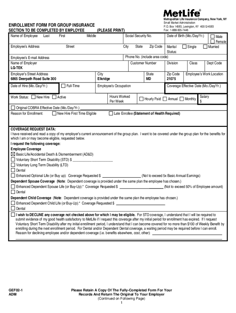 ENROLLMENT FORM FOR GROUP INSURANCE SECTION TO BE COMPLETED BY EMPLOYEE Name of EmployeeLastEmployees AddressFirst×PLEASE PRINT×MiddleSocial Security No. StreetCityZip CodeCustomer NumberEmployers