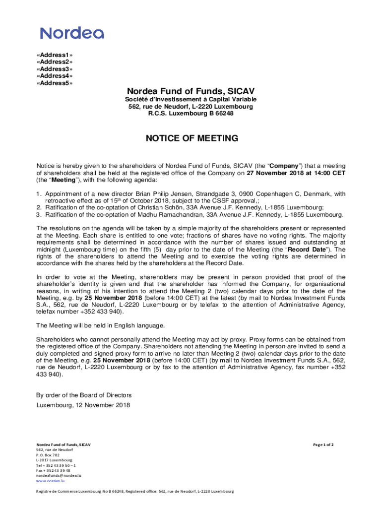 Address1 Address2 Address3 Address4 Address5Nordea Fund of Funds, SICAV So cit dInvestissement Capital Variable 562, rue de Eudora, L2220 Luxembourg R.C.S. Luxembourg B 66248NOTICE OF MEETING Notice