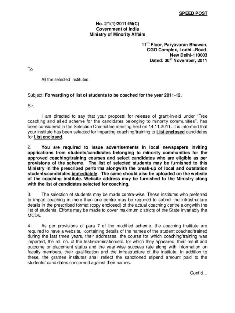 SPEED POST No. 2×1(1)/2011IM×C) Government of India Ministry of Minority Affairs 11th Floor, Paryavaran Shawn, CGO Complex, Lodi Road, New Delhi110003 TH Dated: 30 November 2011 To Pioneer Foundation