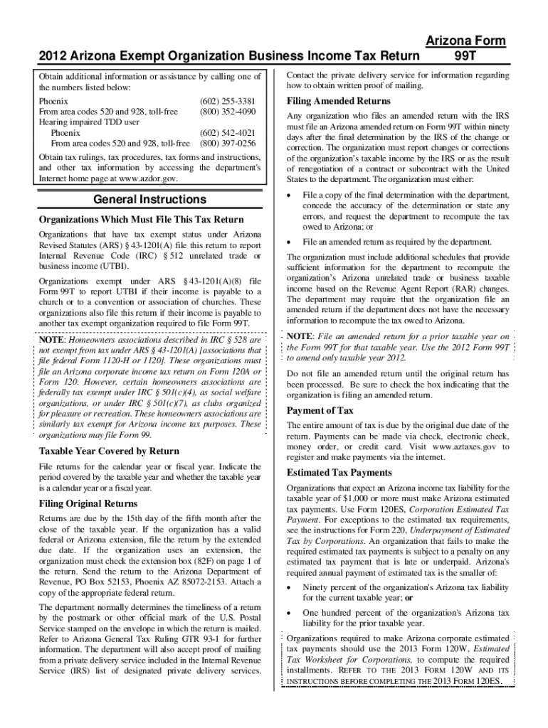 Arizona Form 2012 Arizona Exempt Organization Business Income Tax Return 99T Obtain additional information or assistance by calling one of the numbers listed below: Phoenix (602× 2553381 From area