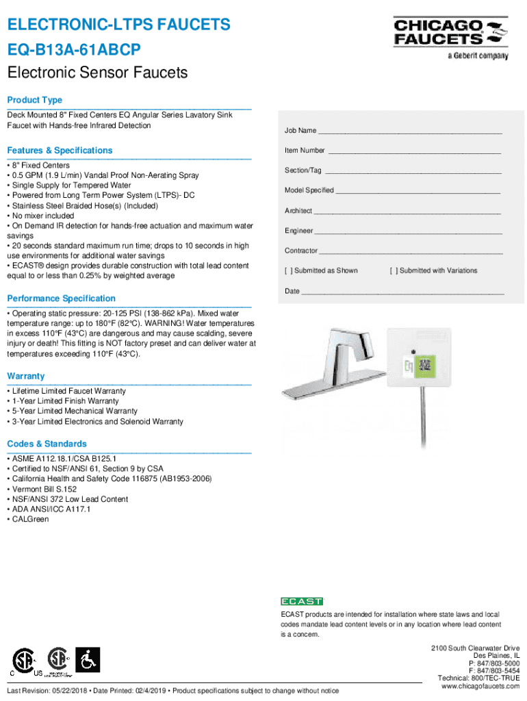 Get the free ELECTRONIC-AC FAUCETS EQ-B13A-51ABCP Electronic Sensor Faucets