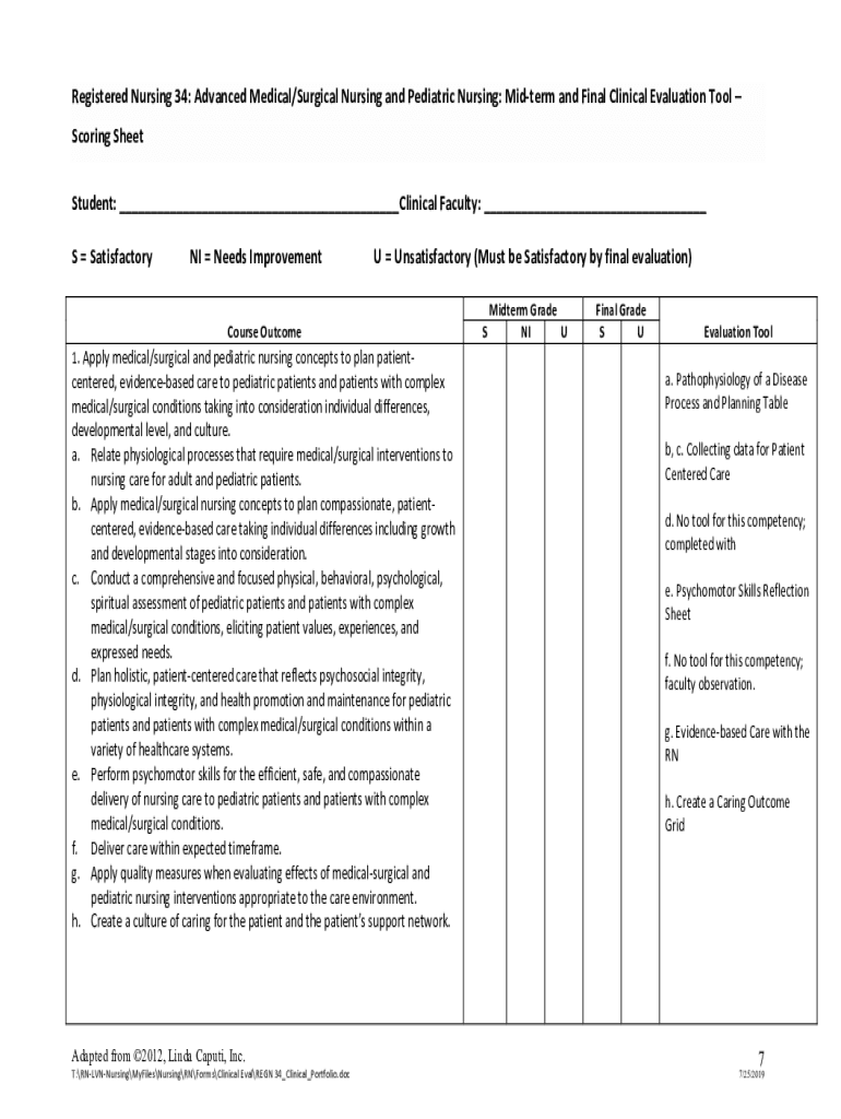 RegisteredNursing34:AdvancedMedical×SurgicalNursingandPediatricNursing:MidtermandFinalClinicalEvaluationTool Scoresheet Student:___ClinicalFaculty:___ SSatisfactoryNINeedsImprovementUUnsatisfactory×MustbeSatisfactorybyfinalevaluation)
