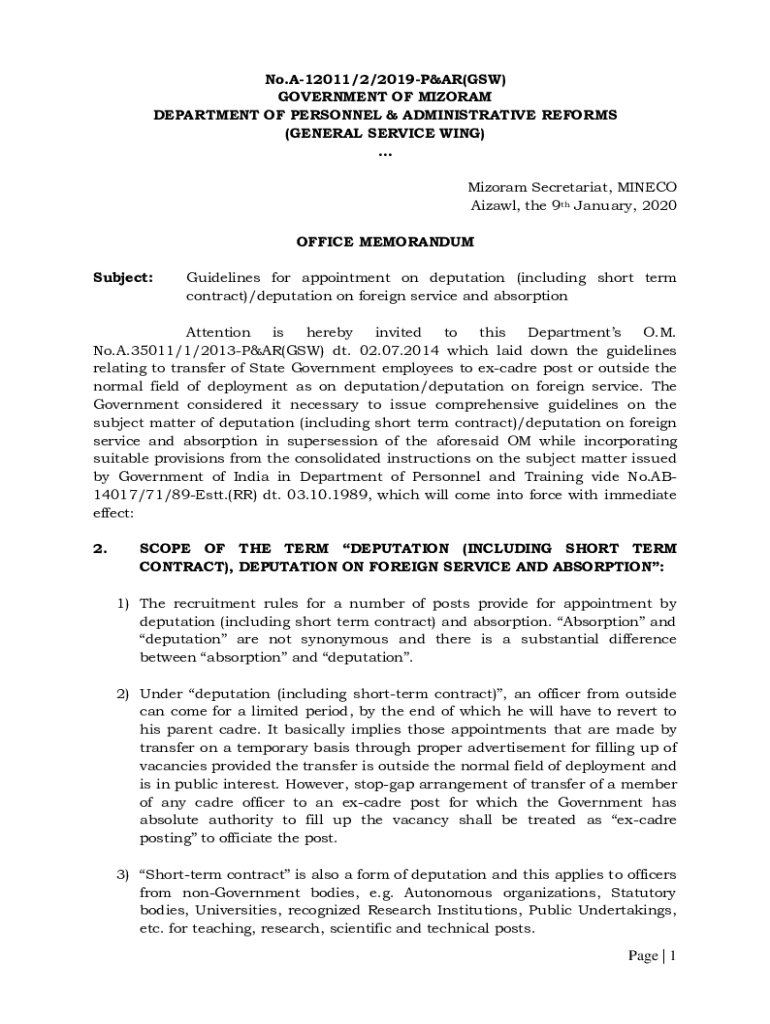 Get the free No.A-12011/2/2019-P&AR(GSW) GOVERNMENT OF MIZORAM ...