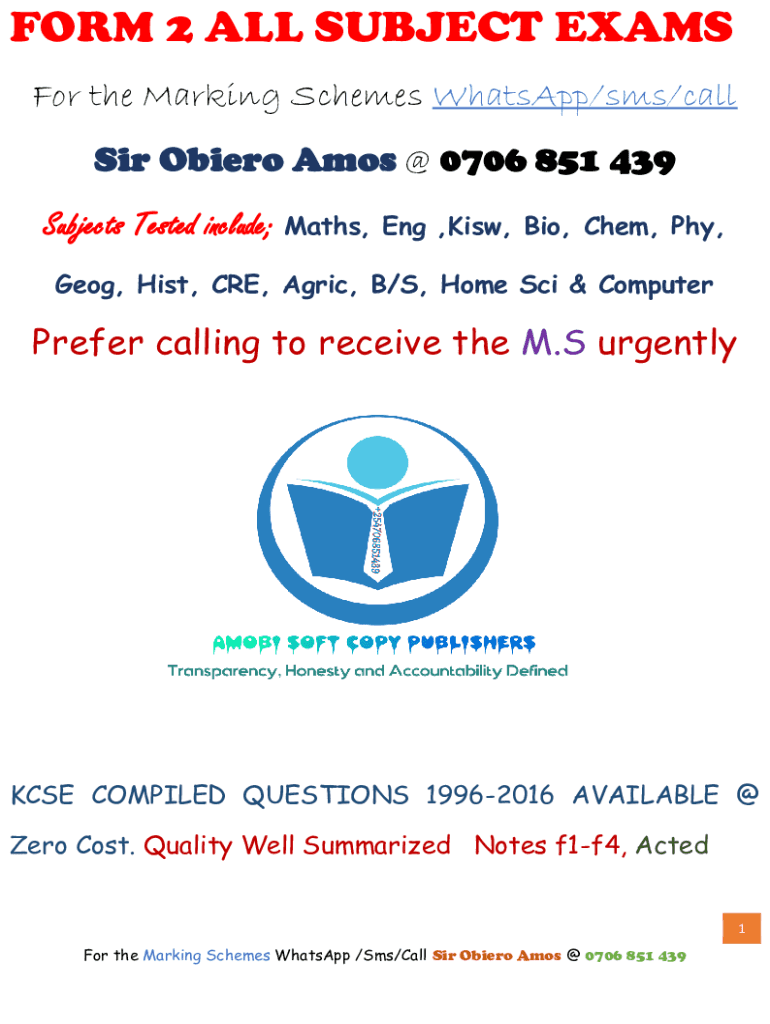 FORM 2 ALL SUBJECT EXAMS For the Marking Schemes WhatsApp×SMS×call Sir Bear Amos @ 0706 851 439 Subjects Tested include; Math, Eng, Kiss, Bio, Chem, PHY, Geog, Hist, CRE, ARIC, B×S, Home Sci &